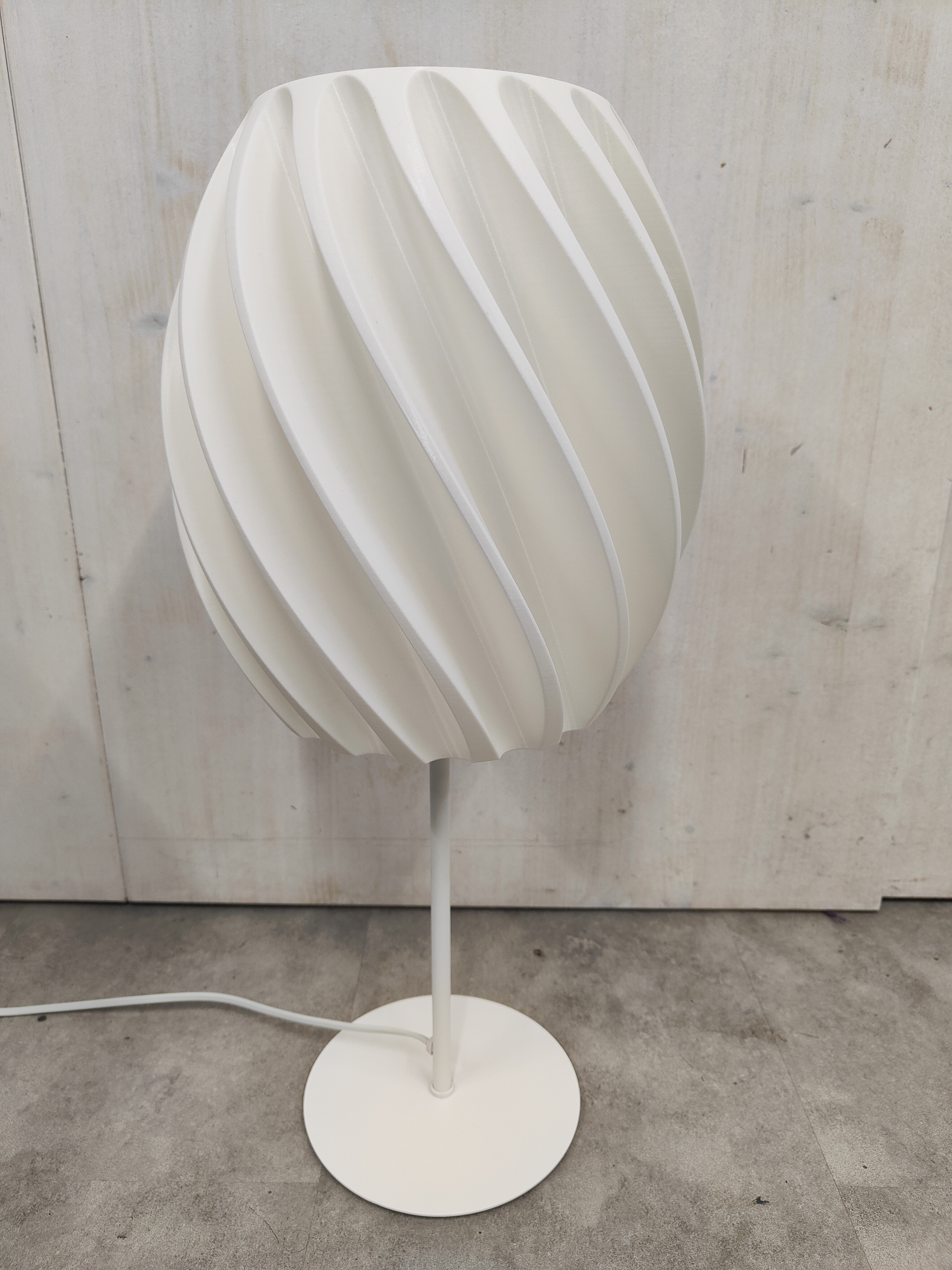 Rundum 3D-gedruckt: Sowohl der skulpturale Lampenschirm als auch der passende Sockel werden direkt in unserem Atelier gefertigt. Die organische Form sorgt für ein lebendiges Licht- und Schattenspiel.